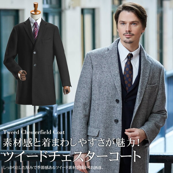 しっかりした厚みと秋冬らしい質感が魅力のツイード素材を使用したチェスターコート!ベーシックなデザインと使いやすいハーフ丈で幅広いシーンに対応!【素材】 ◆ツイード・ブラック表地:ウール…40% ポリエステル…60%裏地:ポリエステル…100%◆ヘリンボーン・グレー表地:ウール…30% ポリエステル…70%裏地:ポリエステル…100% 【仕様】 3ツボタン シングルフロント センターベント 総裏仕立て 両側に内ポケット見返しピンポンステッチ ラペルにミシンステッチ(※サイドポケットの仕様がカラーにより異なります。