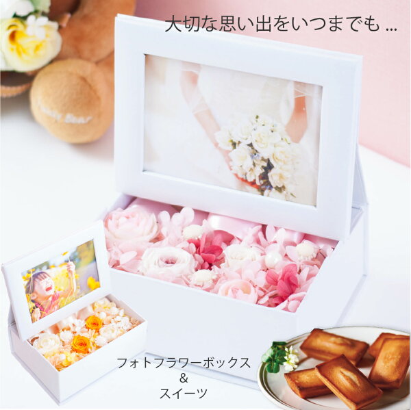 ギフト対応フォトサービス(無料)、ラッピング(無料)、手提げバッグ(無料)、メッセージカード(無料)、あす楽(午前中までのご注文確定)、配達日時指定、コンビニ&郵便受取ご用途季節お正月 正月 成人式 成人の日 愛妻の日 バレンタインデー フラワーバレンタイン ホワイトデー 合格祝い ひな祭り 桃の節句 卒業祝い 卒業式 卒園祝い 卒園式 イースター 入学祝い 入学式 入園祝い 入園式 母の日 母の日プレゼント父の日 父の日ギフト 暑中見舞い 御中元 お中元 サマーギフト お盆 お彼岸 秋の花贈り 敬老の日 敬老の日ギフト ハロウィン 七五三 いい夫婦の日 ウィンターギフト クリスマス Xmas クリスマスプレゼント クリスマスギフト祝事日常の贈り物結婚祝い 結婚記念日 結婚式 記念日 お祝い 御祝い 内祝い 金婚式 銀婚式 真珠婚式 珊瑚婚式 結婚内祝い 新築祝い 新築内祝い 誕生日 誕生日プレゼント バースデー バースディ 出産祝い 出産内祝い 七五三祝い 七五三内祝い 快気祝い 快気内祝い 退院祝い 引越し祝い 1か月記念 6か月記念 半年記念 1年記念 発表会 コンサート リサイタル 個展 お祝い返し 贈り物 楽屋花 お見舞い お礼 フラワーギフト長寿のお祝い還暦(数えで61歳のお祝い) 古希(数えで70歳のお祝い) 喜寿(数えで77歳のお祝い) 傘寿(数えで80歳のお祝い)米寿(数えで88歳のお祝い) 卒寿(数えで90歳のお祝い) 白寿(数えで99歳のお祝い) 百寿(数えで100歳のお祝い)お供えお供え お悔やみ 御仏前 御霊前 お供えギフト お供え物 四十九日法要 法事 初七日 仏花 お供え花 命日 月命日 一周忌 喪中見舞い ご供養 ペット供養ビジネス開店祝い 開業祝い 周年記念 昇格祝い 就任祝い 昇進祝い 新社屋 事務所移転 昇進 転勤 定年退職 退職祝い 離任式 送別会 就任式 贈答品 歓迎会 歓送迎会 記念品 開院祝い 受付 オープン記念贈り相手お父さん お母さん 父 母 おじいちゃん おばあちゃん祖父 祖母 妻 夫 男性 女性 彼氏 彼女 恋人 家族 両親 新郎 新婦 孫 女の子 男の子 友人 友達 女友達 男友達 上司 同僚 恩師 先輩 後輩 取引先 先生 担任 義父 義母 10代 20代 30代 40代 50代 60代 70代 80代 90代『フォトフラワーボックス フィナンシェ スイーツギフト』 【プリザーブドフラワー 写真立て 結婚祝い スイーツ フォトフレーム 結婚記念日 卒業祝い 退職祝い 母の日 クリスマス プリザードフラワー プレゼント ギフト】