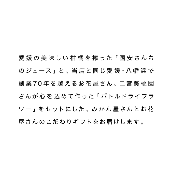 ここがポイント 愛媛八幡浜のみかん屋さんと、お花屋さんがこだわって作ったギフトセット! みかんジュースは、今シーズン初搾りしたもので、全て3代目、4代目国安が厳選した旬のものを使用。