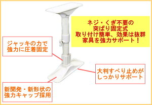 【サイズ】 伸縮サイズ:220〜270mm キャップサイズ:72×212mm パイプ径:29.6mm、25.4mm 【材質】 パイプ類…鉄パイプ:エポキシ樹脂粉体塗装 樹脂部品…ABS樹脂・ポリエチレン ねじ類…鉄製:メッキ仕上げ 【特徴】 急な地震などによる転倒、ズレ防止に最適! 耐圧は200kg ジャッキの力で強力に圧着固定。
