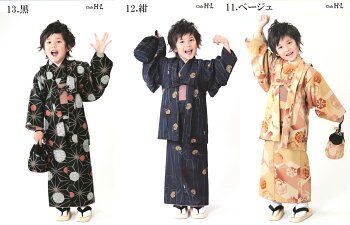 【セット内容】 きもの(伊達衿縫付済み)、羽織、長襦袢(半衿縫付済み)、兵児帯、履物、巾着 商品番号11,12,13には足袋が付いておりませんので、 別途ご購入をご希望の場合はオプションよりお選びください。